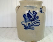 Vintage StoneWare Two Handled Crock - Harrington & Burger Rochester New York Pottery - Grey with Blue Slip Cabbage Flower Design Salt Glaze